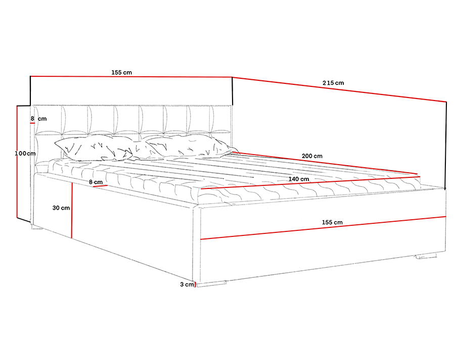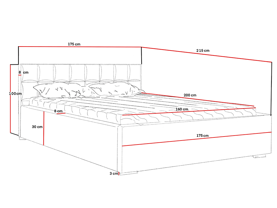 200×200cm → szerokość zagłówka 215cm - Wymiary szczegółowe