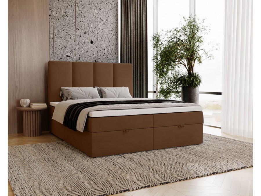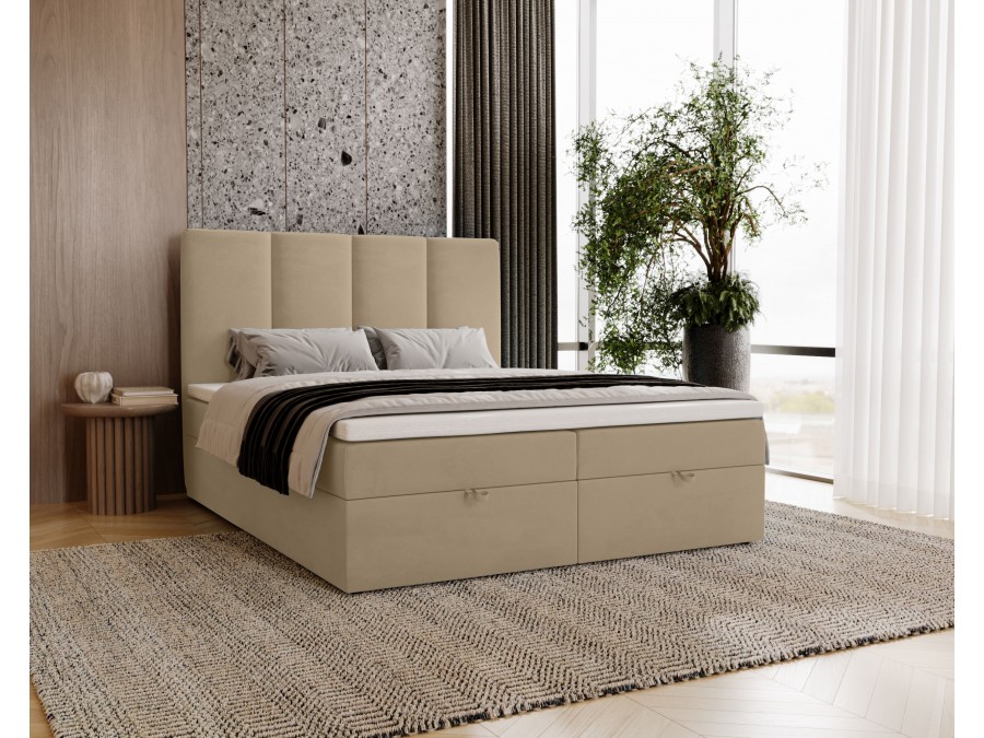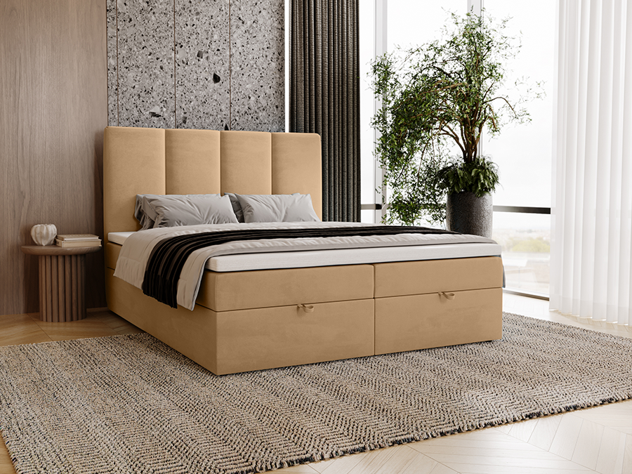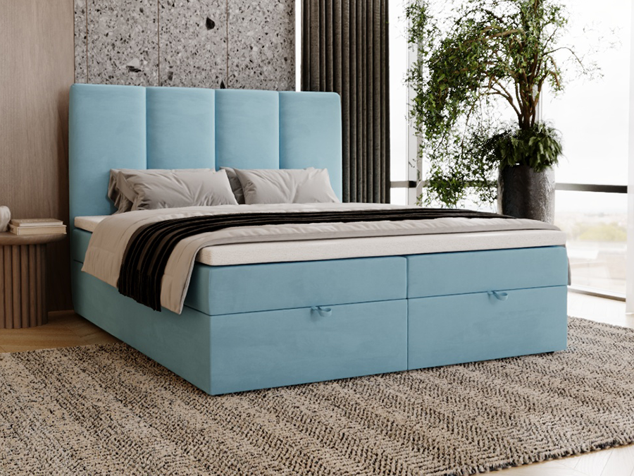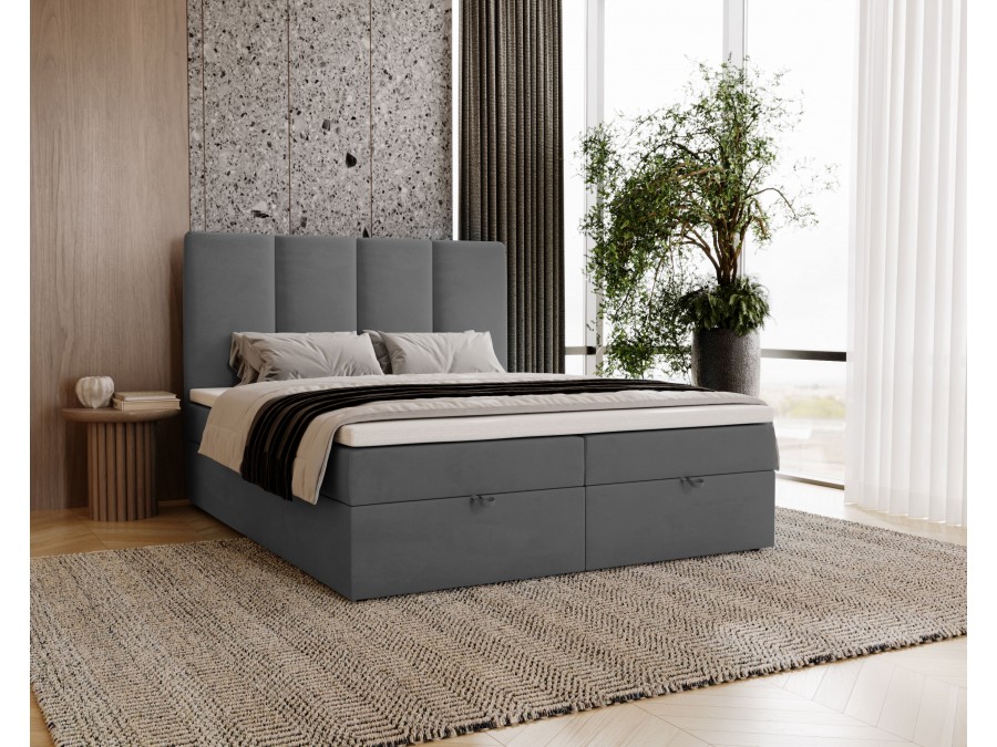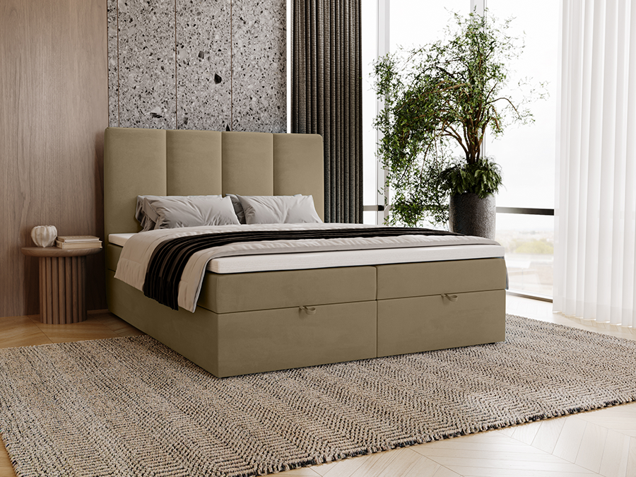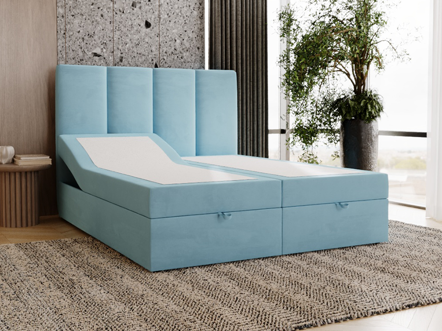 Wygodne łóżko kontynentalne do sypialni z tapicerowanym zagłowiem i korpusem. Łóżko kontynentalne w zestawie posiada wbudowaną w konstrukcję skrzynię z materacami, dzięki czemu nie musimy dokupować dodatkowych materacy. Łóżko doskonałe do nowoczesnych wnętrz. Jest możliwość wyboru rozmiaru oraz tkaniny i koloru łóżka ze wzornika tkanin. Pozwoli to na dostosowanie wyglądu łóżka do wystroju i aranżacji Państwa sypialni. Łóżko posiada funkcję podnoszenia i regulowania wysokości zagłowia.