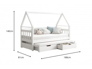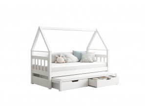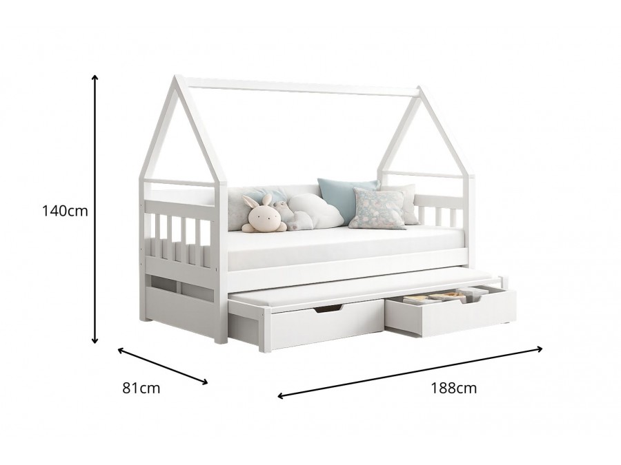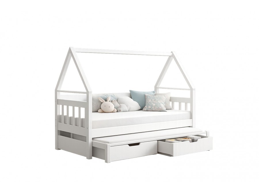 Dzięki konstrukcji w kształcie domku łóżko tworzy przytulny klimat w pokoju, a wysuwane dolne spanie zapewnia wygodne miejsce dla dwóch osób – idealne dla rodzeństwa.