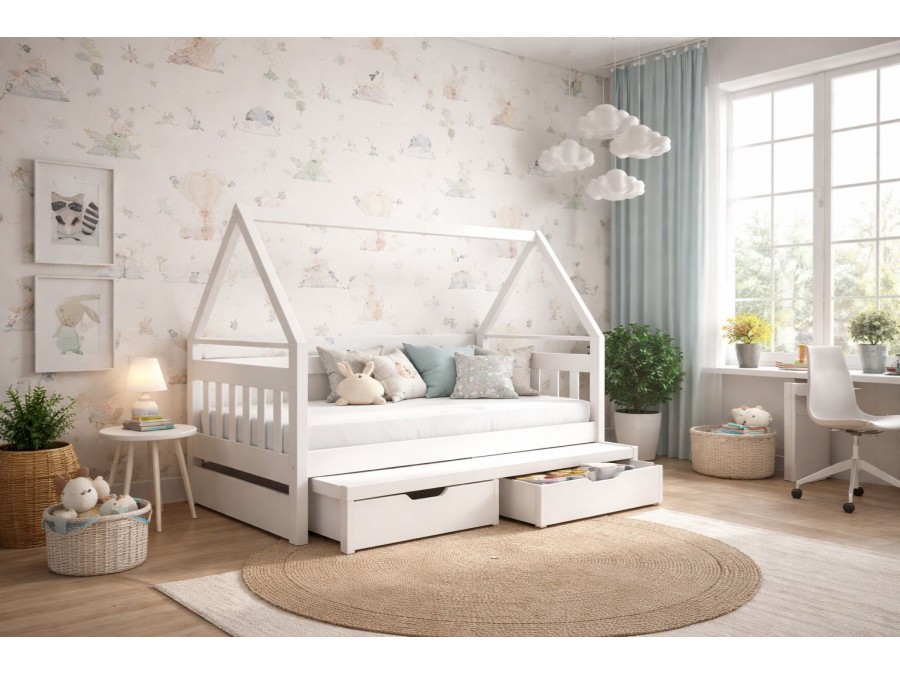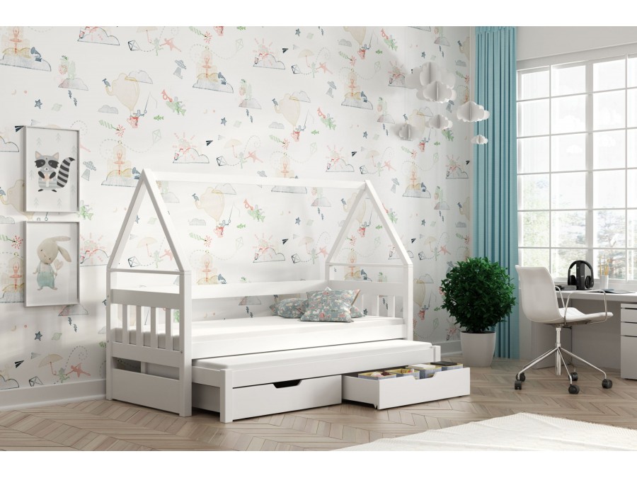 Dzięki konstrukcji w kształcie domku łóżko tworzy przytulny klimat w pokoju, a wysuwane dolne spanie zapewnia wygodne miejsce dla dwóch osób – idealne dla rodzeństwa.