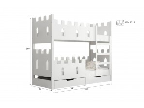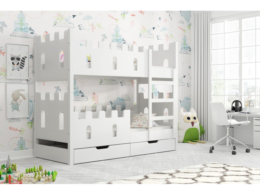 Łóżko piętrowe LUNA zamek to idealne rozwiązanie do pokoju dziecięcego – łączy oszczędność miejsca, wygodę oraz wyjątkowy wygląd.