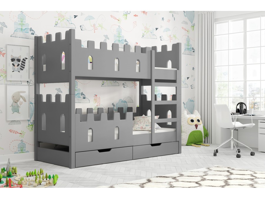 Łóżko piętrowe LUNA zamek to idealne rozwiązanie do pokoju dziecięcego – łączy oszczędność miejsca, wygodę oraz wyjątkowy wygląd.