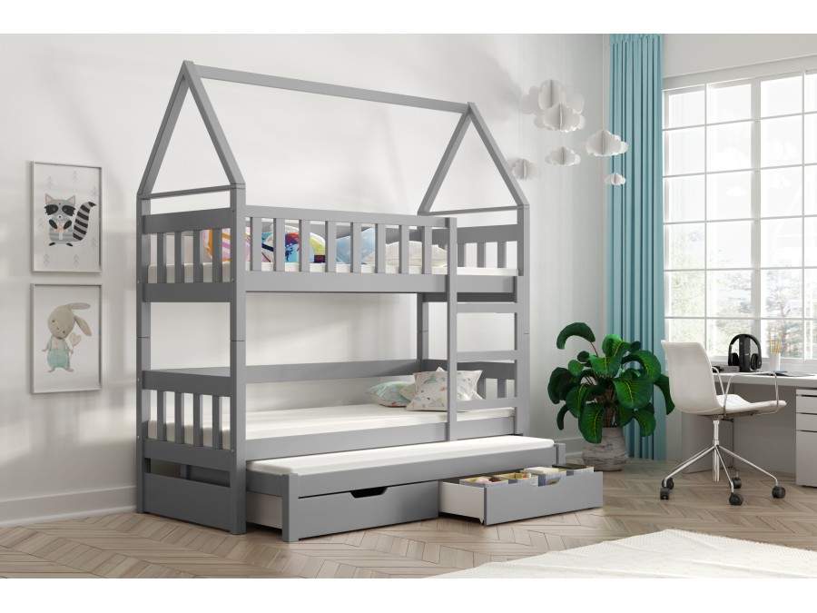 Łóżko piętrowe LISA dla 3 osób – łóżko dziecięce domek z wysuwanym spaniem i szufladami
