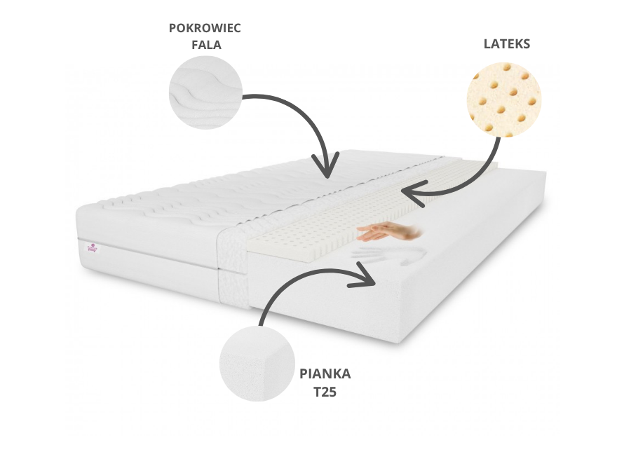 Dodatkowa warstwa z maty lateksowej o grubości 2cm. Doskonale dostosowuje się do kształtu ciała. Dzięki systemowi otworów na całej powierzchni, zapewnia ciągłą wentylację.
