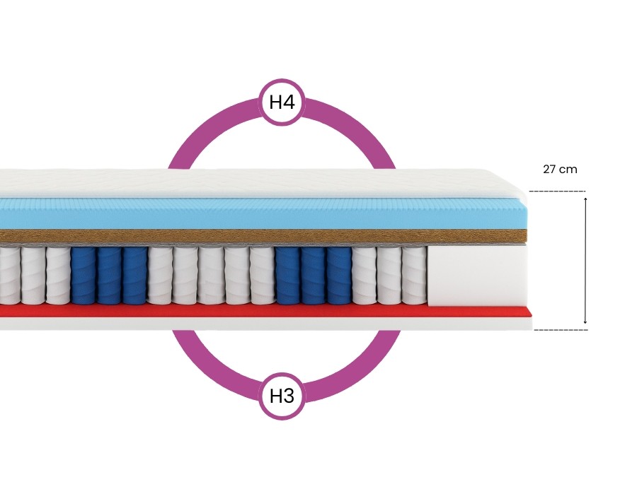 Cena 1 265 zł Cena podstawowa 4 217 złMaterac kieszeniowy 140x200 PREMIUM KOKOS H3/H4, 27cm, warstwa masująca, pocket, kokos, 7 stref