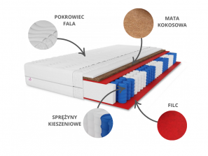 Mata kokosowa – to wkład z naturalnego kokosa. Zwiększa on twardość i wytrzymałość materaca oraz poprawia cyrkulację powietrza oraz ma działanie antyalergiczne.