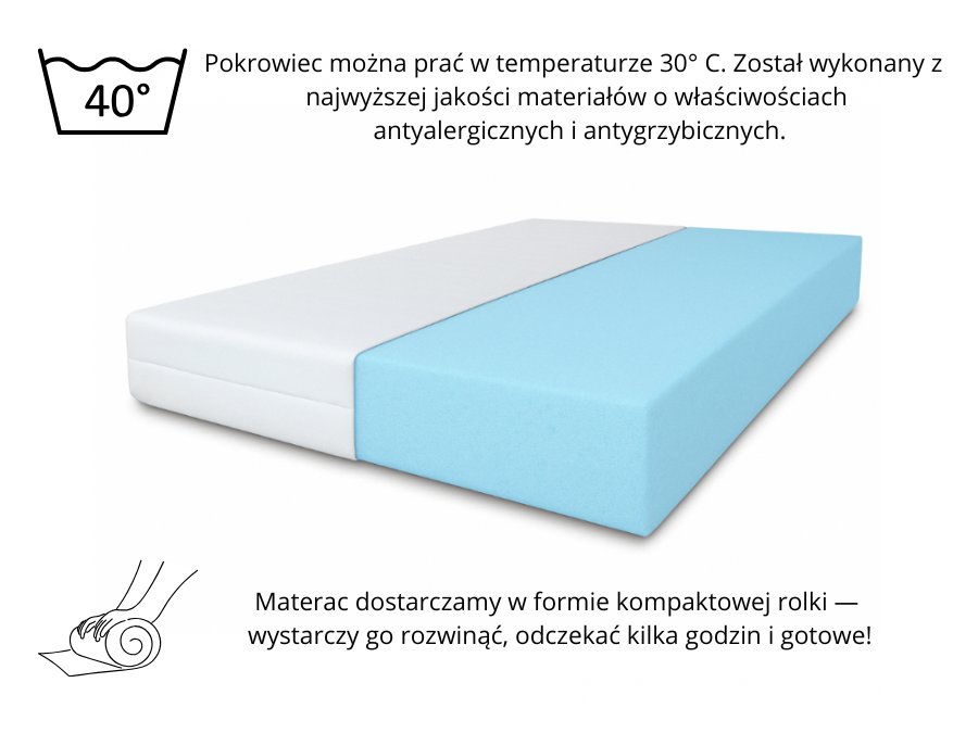 Antyalergiczny materac – posiada on zdejmowany pokrowiec, który można wyprać w pralce, dzięki czemu łatwiej utrzymać higienę snu. Wykonany jest z materiału posiadającego atest niepalności.