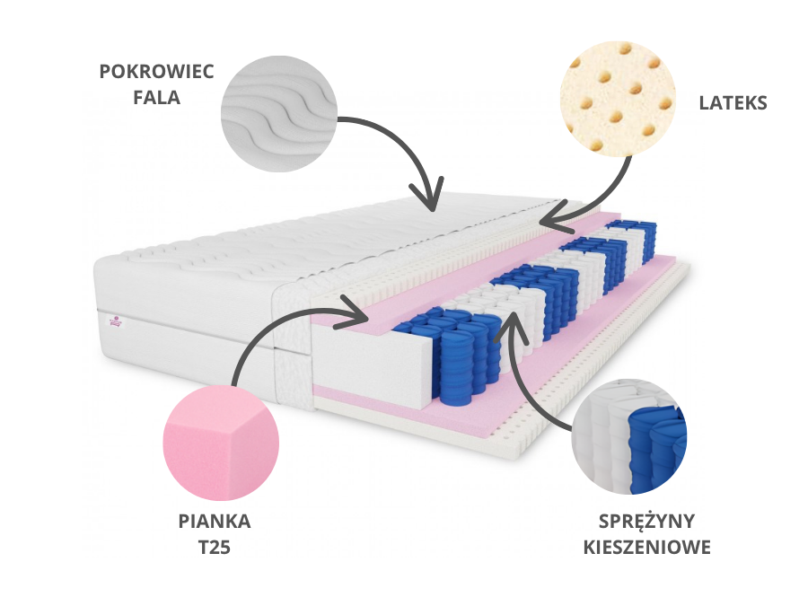 To luksusowy materiał, który łączy komfort, higienę i długowieczność. Wyróżnia się elastycznością punktową, doskonałą cyrkulacją powietrza oraz odpornością na odkształcanie. Pianka lateksowa jest naturalnie odporna na rozwój roztoczy, pleśni i bakterii, co czyni ją jednym z najlepszych wyborów dla alergików i astmatyków.