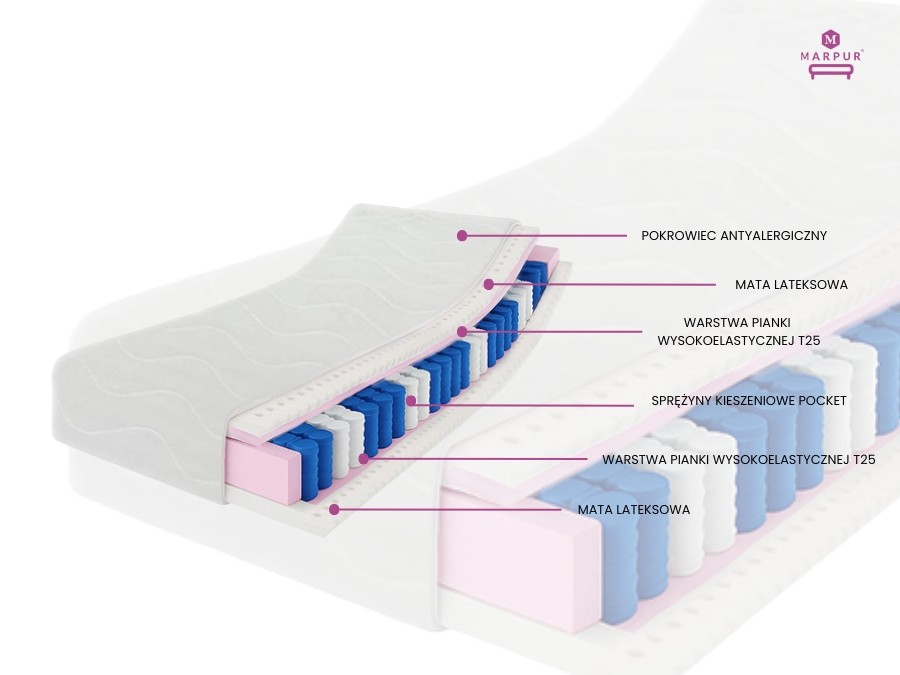 Materac kieszeniowy PARIS 140x200x21 lateks, pocket, 7 stref, antyalergiczny H3 – średnio twardy, pianka T25.