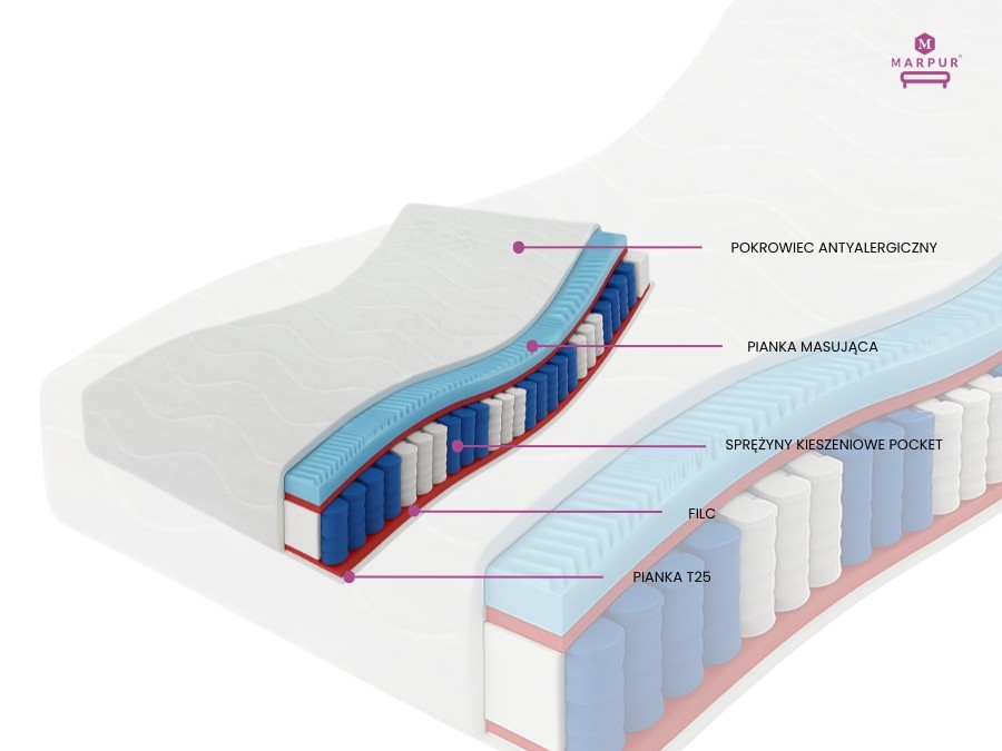 • Sprężyny kieszeniowe POCKET – niezależna praca sprężyn daje punktowe podparcie i dopasowanie do sylwetki, co odciąża stawy i kręgosłup.