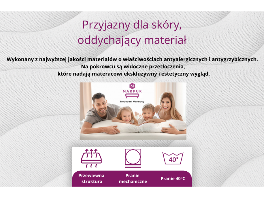 Antyalergiczny materac – posiada on zdejmowany pokrowiec, który można wyprać w pralce, dzięki czemu łatwiej utrzymać higienę snu. Wykonany jest z materiału posiadającego atest niepalności.