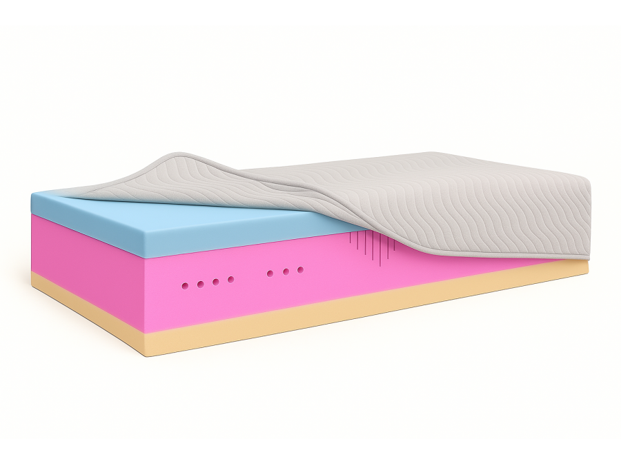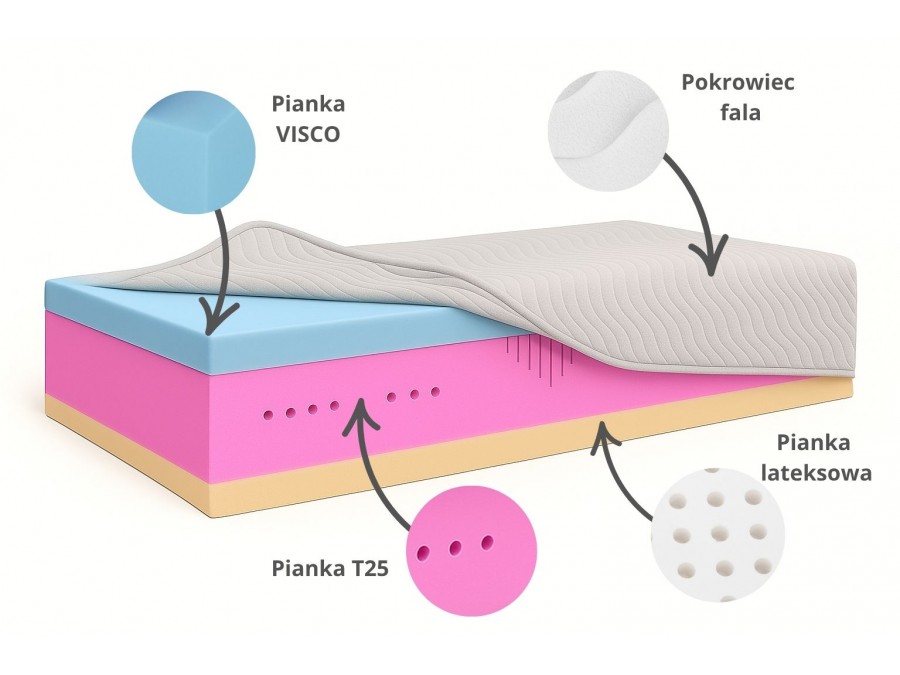 • Pianka VISCO (pianka memory) – termoelastyczna warstwa dopasowująca się do ciała, redukująca nacisk i napięcia mięśni.