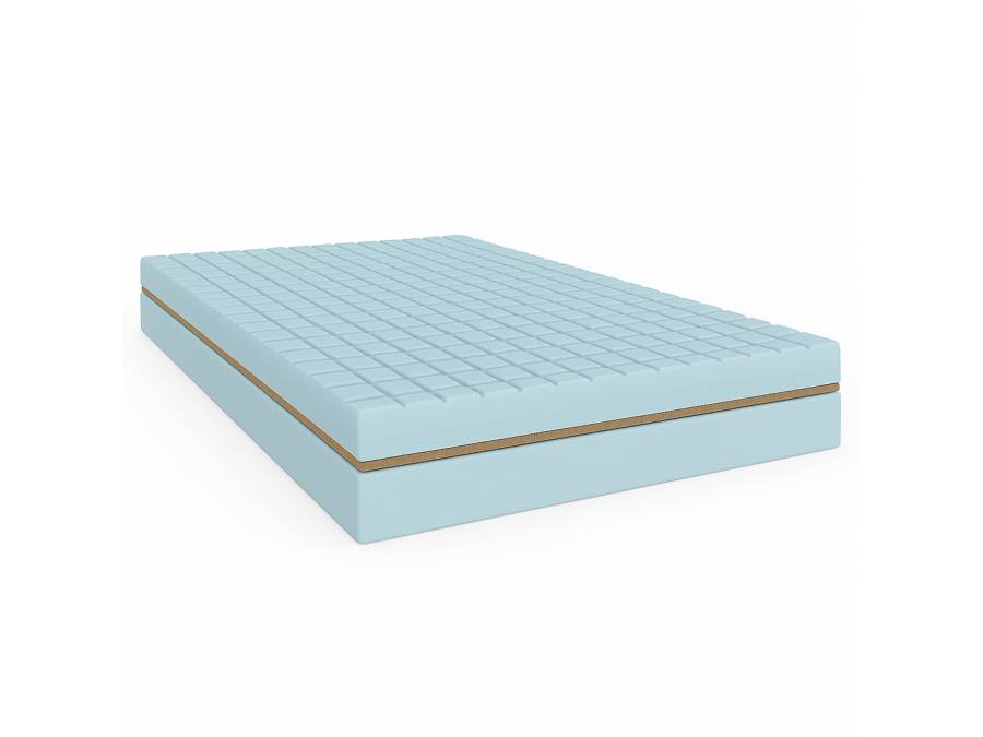 Górna warstwa „KOSTKA” która została precyzyjnie nacięta w regularny wzór kostek o określonej głębokości i rozstawie. Dzięki temu powierzchnia materaca zyskuje trójwymiarową strukturę, która nie tylko lepiej rozkłada nacisk ciała, ale również zapewnia efekt mikromasażu podczas snu.