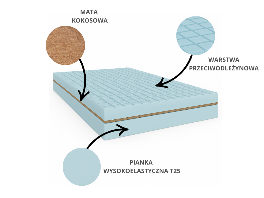 Naturalna 1 centymetrowa warstwa, wykonana z naturalnych włókien orzecha kokosowego. Zwiększa twardość materaca, poprawia jego trwałość oraz cyrkulację powietrza. Posiada właściwości antybakteryjne i antygrzybiczne dzięki czemu chroni przed wilgocią i roztoczami.