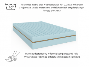 Antyalergiczny materac – posiada on zdejmowany pokrowiec, który można wyprać w pralce, dzięki czemu łatwiej utrzymać higienę snu. Wykonany jest z materiału posiadającego atest niepalności.