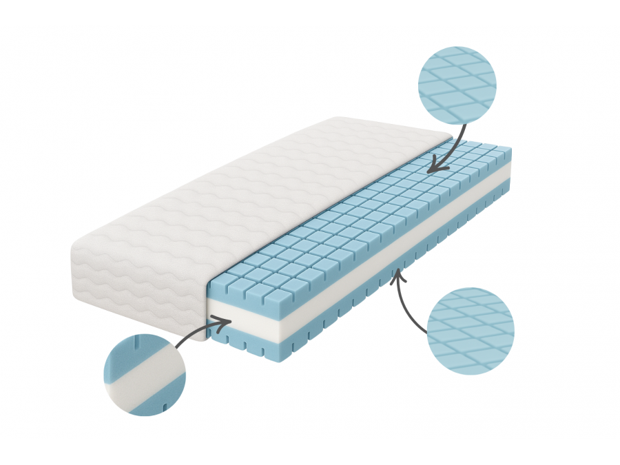 - Pianka wysokoelastyczna – dostępna w wariantach 5, 10 i 15 cm, pozwala dopasować stopień twardości i komfortu do indywidualnych potrzeb.