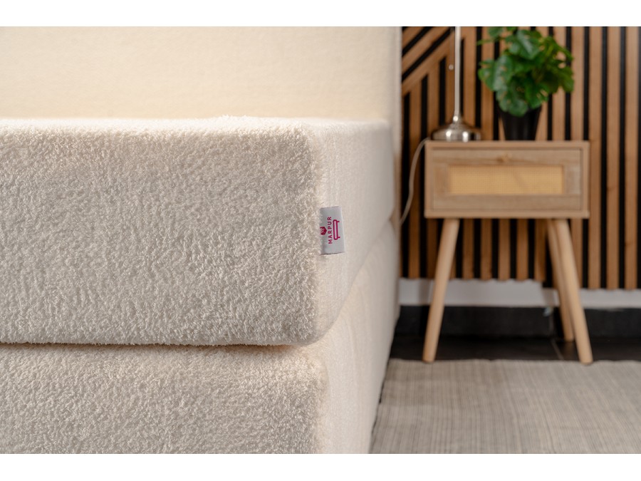 Na sprężynach kieszeniowych znajduje się materac z naszej kolekcji – Salsa o wysokości 18cm, który dodaje łóżku wyjątkowej miękkości i ergonomii. Materac ten doskonale dopasowuje się do ciała, odciąża mięśnie i niweluje punkty nacisku. Dzięki swojej strukturze umożliwia swobodny przepływ powietrza, zapewniając higieniczne i świeże środowisko snu. Salsa to materac uniwersalny – odpowiedni dla osób o różnych potrzebach i preferencjach dotyczących twardości.