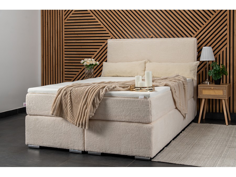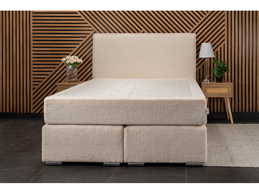 Dolna część łóżka to masywna, tapicerowana skrzynia, o wymiarze 30cm, która stanowi fundament całej konstrukcji. Wykonana z wysokogatunkowych materiałów drewnianych, gwarantuje trwałość i odporność na codzienne użytkowanie. Skrzynia pokryta jest miękką, przyjemną w dotyku tkaniną –frotte – co nadaje całości elegancki, nowoczesny wygląd, idealny do każdej sypialni.